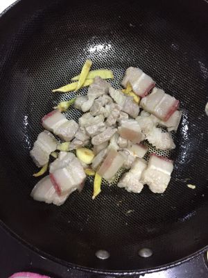 入油,生姜,蒜子把肉炒微微黄,放入料酒,老抽,冰糖(冰糖在入肉前放入也可以)