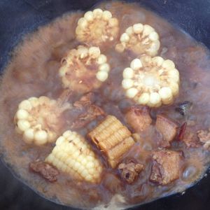 放到锅里,加一杯水,放入斩段的玉米,大火烧开转小火炖十分钟。