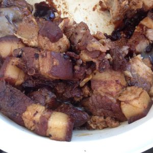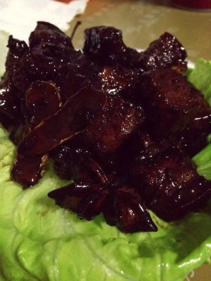 倒入生抽跟老抽,比例是3:1,翻炒匀后锅中加水盖过红烧肉,小火慢炖一小时,加入味精,待汤汁收尽后,起锅,大功告成。