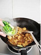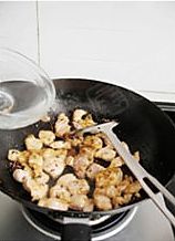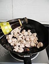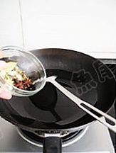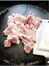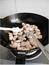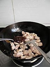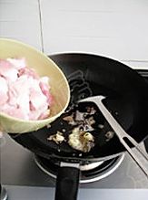 沥干的肉块放入油锅中翻炒。加入干辣椒 和适量酱油和料酒