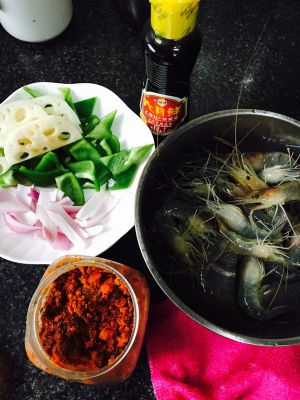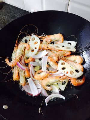 比炒菜略多的油,放虾煎炒30秒,依次加入姜、蒜、洋葱、藕片炒30秒
