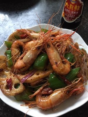 另起油锅,和炒菜油量差不多,油热到7成时,倒入葱姜蒜,花椒,翻炒,倒入虾,加入盐,十三香适量,泡椒(根据自己口味)翻炒,汤汁不多时,加入少量鸡精,再翻炒一会,就可以装盘了