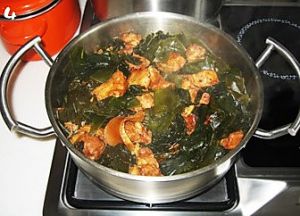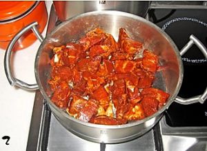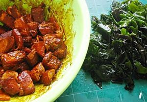 猪肉800克切成大块,用腌肉酱腌制一下。清洗好的海带切大块。
