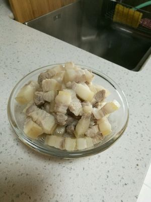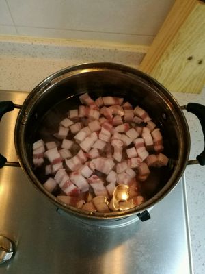 锅中放入清水,将五花肉放入冷水锅中,边煮边撇去血沫,五花肉煮至变色即可,捞出备用。