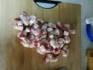 将五花肉切块,放入锅中焯一遍水,然后用凉水清洗备用