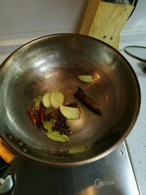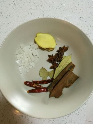 准备好配料,桂皮、香叶、八角、辣椒、冰糖