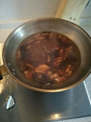 上色后锅中加入适量清水,葱姜,桂皮,八角,香叶,盐,鸡精,十三香大火把水烧开,然后转小火