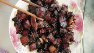 五花肉带皮一面涂上蜂蜜在干锅上烙一下,让肉皮显得紧致。(涂上蜂蜜是为了让肉颜色更好看)连皮切成小块。(因为到了后期才想上传菜谱,所以图片没有抱歉~)