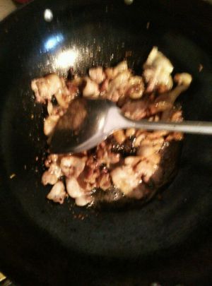 水汽炒散,没有酒味道时候,把甜面酱倒进去,下姜蒜花椒豆豉,炒香