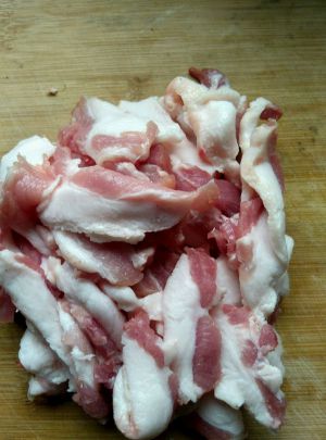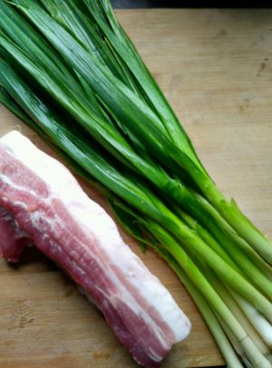 准备的食材有半肥瘦的猪肉.蒜苗。