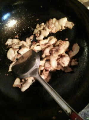 肉片炒至吐油时方能下调料,烹料酒,在放入五香粉一勺