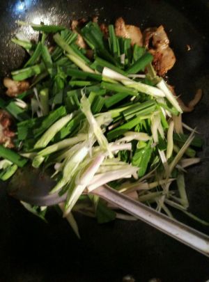 放入蒜苗炒断生后放味精,翻炒均匀后起锅。