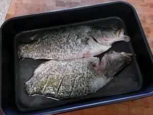 买回来鱼,去头洗净,去腥线,鱼头往下,用刀划开,找到腥线,用手轻拍鱼腹,慢慢把腥线抽出来,然后把鱼腹刨开两半,鱼脊不要切通,在鱼腹抹上少许盐和胡椒粉,倒点料酒,抹匀,把葱姜蒜铺在鱼腹,然后倒上少许料酒。