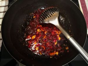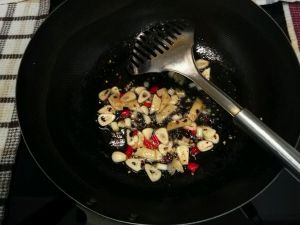 锅中少许油,油热,花椒炸出香味,放入葱姜蒜煸炒。