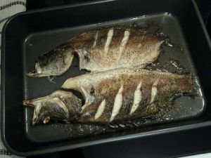 花花这次用的是桂鱼,其实什么鱼都可以,但花花倾向于皮厚的鱼类。鱼洗净清干净腹内,从背部切块,摊开成一片,抹上一层厚油,洒上盐,放于烤盘中,入烤箱,400华氏度烤15分钟。