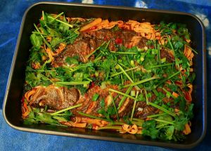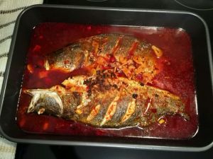 最后将汤汁倒掉,撒上点胡萝卜,进烤箱再烤10分钟;就可以吃了,酸辣味,鱼肉鲜嫩