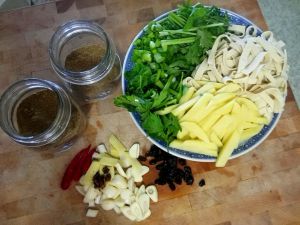 配料,土豆切条,豆腐皮切宽条焯水沖凉沥干,芹菜切段,香菜段,葱丁。