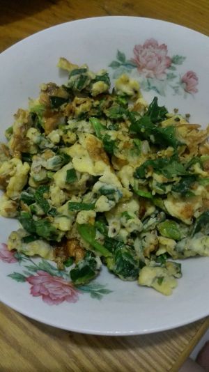 刚才说的芹菜叶去哪辣??在案板上把芹菜叶使劲抓着,用刀切碎,放碗里备用,打三个鸡蛋,和芹菜叶和匀,放点盐调味,放点黑胡椒味道更佳,想吃嫩一点的,打鸡蛋放盐后加点水,然后就下锅摊鸡蛋,可以吃整得也可以炒碎,个人觉得家里吃就炒碎了吧。OK,一篇冗长的菜谱就结束了!!