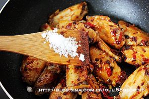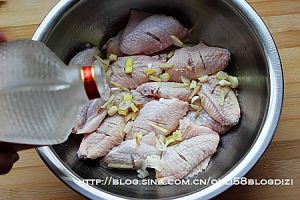 鸡翅膀放入一干净盆中,撒1小捏盐、撒葱姜末;