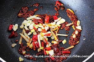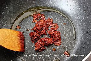 将豆瓣酱放入锅中,小火煸炒出红油;