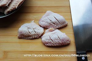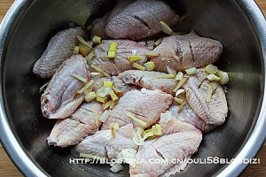 鸡翅膀放入清水中浸泡半天,将血水泡出后,清洗干净,并在鸡翅上划伤几刀,取部分葱姜切碎备用;