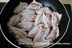 取一平底锅,锅中不放一滴油,将鸡翅膀正面向下平铺在锅底,放火上小火加热;