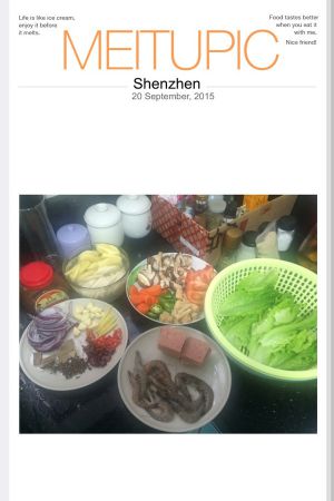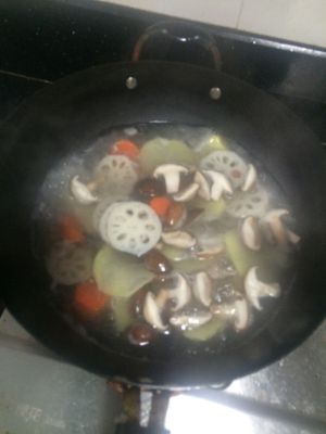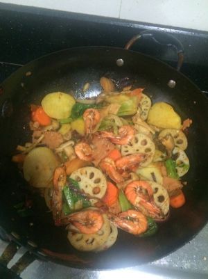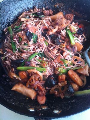 先用花生油把五花肉翻炒八分熟,然后依此放入培根火腿、鱼豆腐继续翻炒,倒入海底捞的料,在按序放入木耳、藕片、腐竹面筋等,出锅前在放入蔬菜类至炒熟。这就算成品啦。