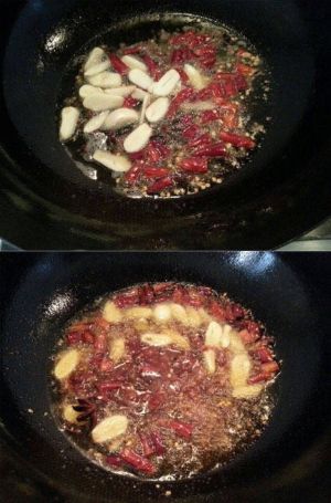 热锅倒油烧热,先下干辣椒、花椒、八角、桂皮、香叶,再放大蒜、姜、小红辣椒炒出香味。放郫县豆瓣酱,炒出红油(根据食材的量放,我放了两勺)