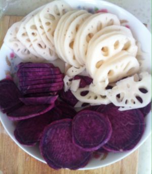 藕和紫薯切成圆薄片,这个是要过水焯一下,下锅比较好熟。
