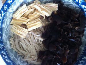 金针菇,木耳,腐竹,洗净切小,都先后焯一下水。