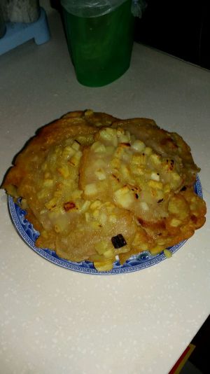 剩下的最后一点材料全部倒进锅里,所以最后一个饼有点厚了。 趁着饼翠翠的热热的赶紧吃,香啊!