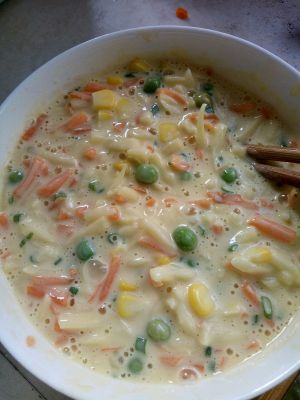 接下来把玉米粒,胡萝卜丝,土豆丝以爱加入面粉中和水搅拌均匀