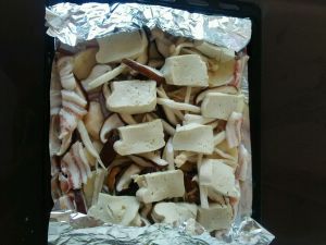 将焯烫好的配菜放入烤盘中。