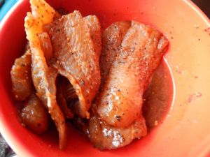 调一碗香料,1勺十三香、3勺干辣椒粉、4勺孜然粉,拌匀;