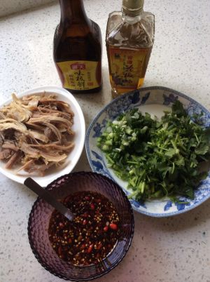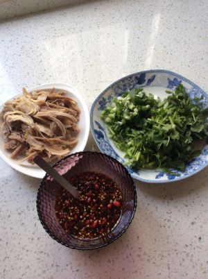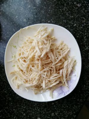 鸡腿肉放凉撕丝,大小依自己的喜好;