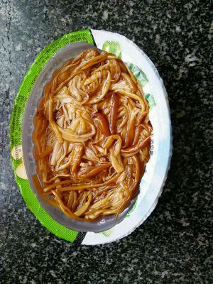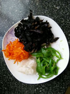 木耳,青椒切丝淖水短生。萝卜切丝用盐淹一下去除多余的水分。