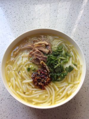 捞 起面条,把凉拌好的鸡丝倒入面条里,一起拌均匀即可开吃.