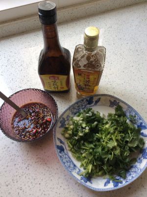 佐料加蒜泥、小米辣(切碎)、味极鲜、花椒油、葱花、香菜;