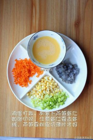 鸡蛋打散,蔬菜切碎,洋葱切成洋葱圈。虾挑线后切碎