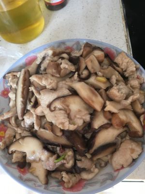 热锅,倒油,放入肉片炒变色,依次放葱花,香菇,翻炒。倒适量蚝油,继续翻炒,出锅!~~
