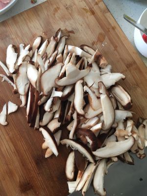 把香菇祛根~抹刀片成片~猪肉切片~黄瓜和胡萝卜切陵型片~葱切马蹄片~姜切丝~蒜切片~香菇用沸水汆烫以下~