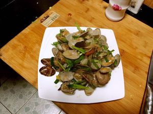 2⃣️香辣花蛤。 1、花蛤、韭菜、葱姜蒜和辣椒。2、花蛤过水开锅就好。3、锅里加入少许油依次放入辣椒、花椒、葱姜蒜、倒入花蛤翻炒,加入糖、盐、蒸鱼豉油和少许清水翻炒后加入韭菜和水淀粉。 4、出锅摆盘。