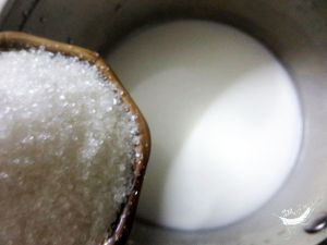 将杏仁汁倒进奶锅里加入白糖煮开后关火