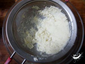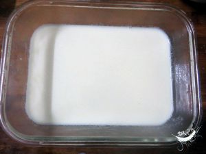 本想做表面椰蓉的,结果手残把椰蓉提前放进去了,然后成了椰蓉夹心了… 口感也成,不过椰蓉不那么脆了 大家可以忽略它… 把奶汁过筛后倒入容器后,然后冷藏2小时左右