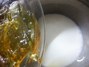 把牛奶,杏仁露还有琼脂加入小奶锅里,开火,煮! 琼脂比较蛮化,多煮一下 融化了它!