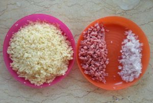 红椒,青椒,蘑菇,虾米切成粒状备用。土豆擦丝,千万不要泡水里!