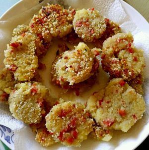 切碎的方肉和洋葱入锅小炒。滤去油,倒入蛋液和面粉,与之混匀。用手捏饼状,再蘸面包糠,入锅煎熟即可。
