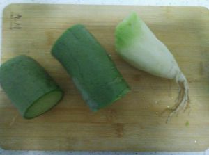 萝卜洗净切三段。青萝卜头尾会辣,中段最好吃,可以生吃,所以我就用萝卜头尾来煎萝卜丝饼