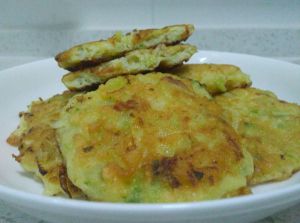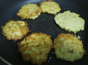 锅里加适量油,比平时炒菜要多一些,萝卜非常吃油。油热之后,用勺子在锅里匀成小饼,小火煎,两面有焦黄色就可以出锅了