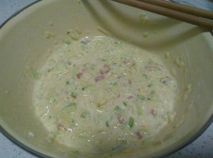 把萝卜丝中的水控干,加一个鸡蛋,放入青椒丝,放面粉,加点水,放虾皮,胡椒粉搅拌均匀,成面湖状。